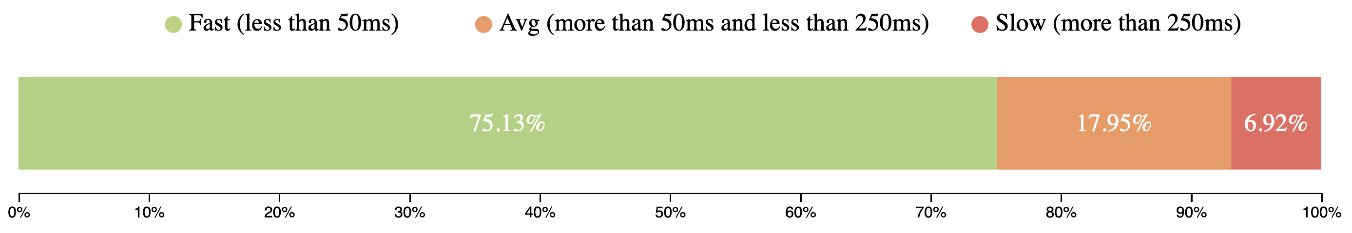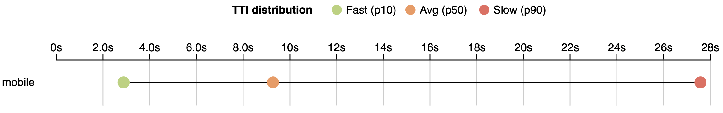 由于不同的限制,CrUX 没有 TTI 数据,但有 FID,它甚至更好,可以反映页面交互性。超过 75% 的移动用户体验的输入延迟为 50 毫秒,用户没有遇到任何卡顿。