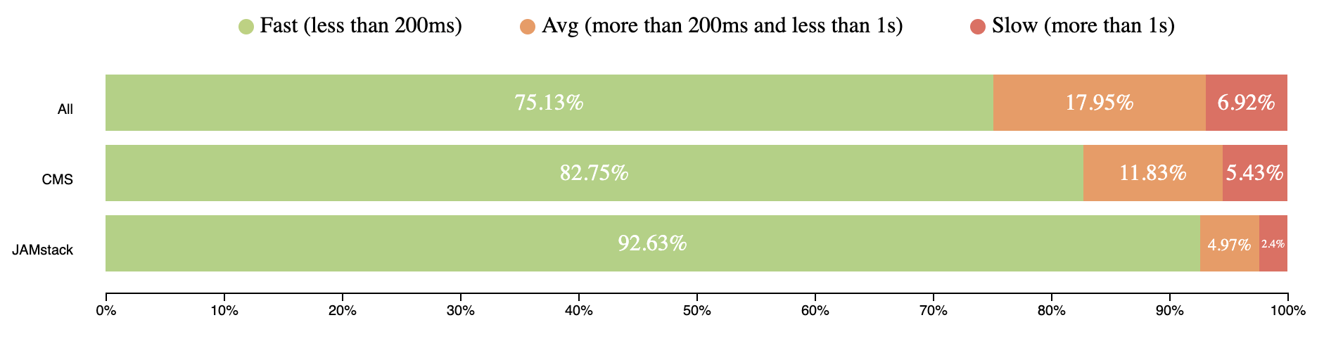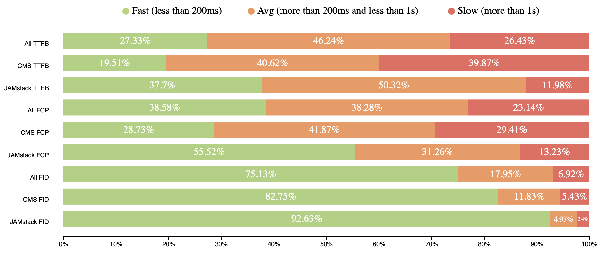 查看 CrUX 数据,JAMstack 网站的性能看起来非常可靠。以下值基于由 Netlify 和 GitHub 提供服务的网站。在 HTTPArchive 论坛 上有一些讨论,您可以参与其中以使数据更准确。