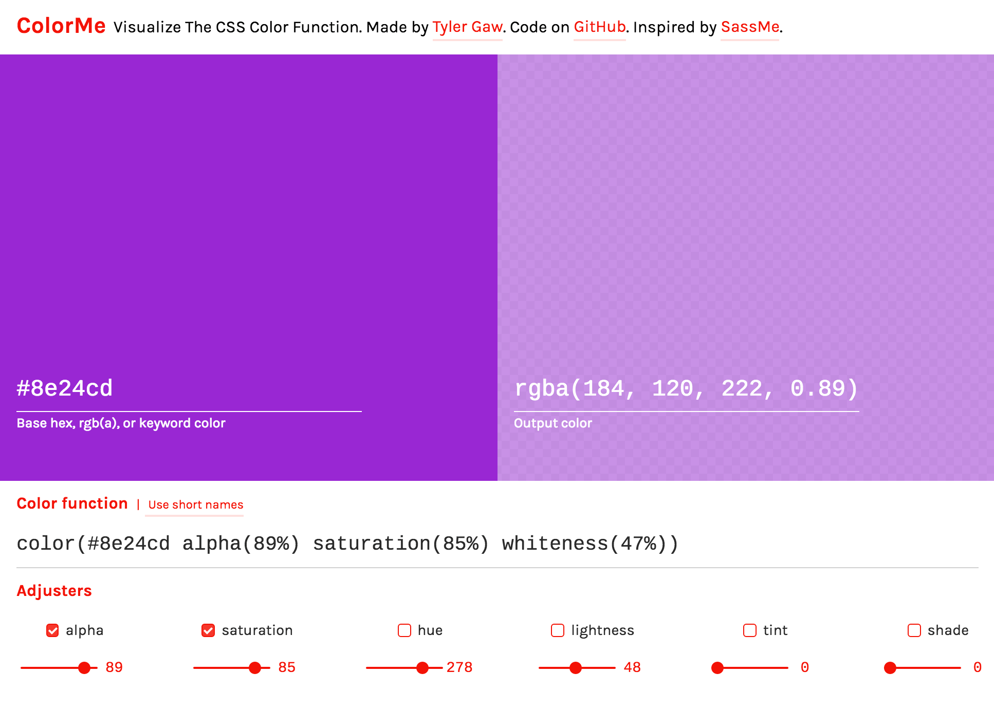 如果您喜欢 Sass 颜色函数,请务必查看 SassMe。它执行 colorme 的操作,但在 Sass 中:http://jim-nielsen.com/sassme