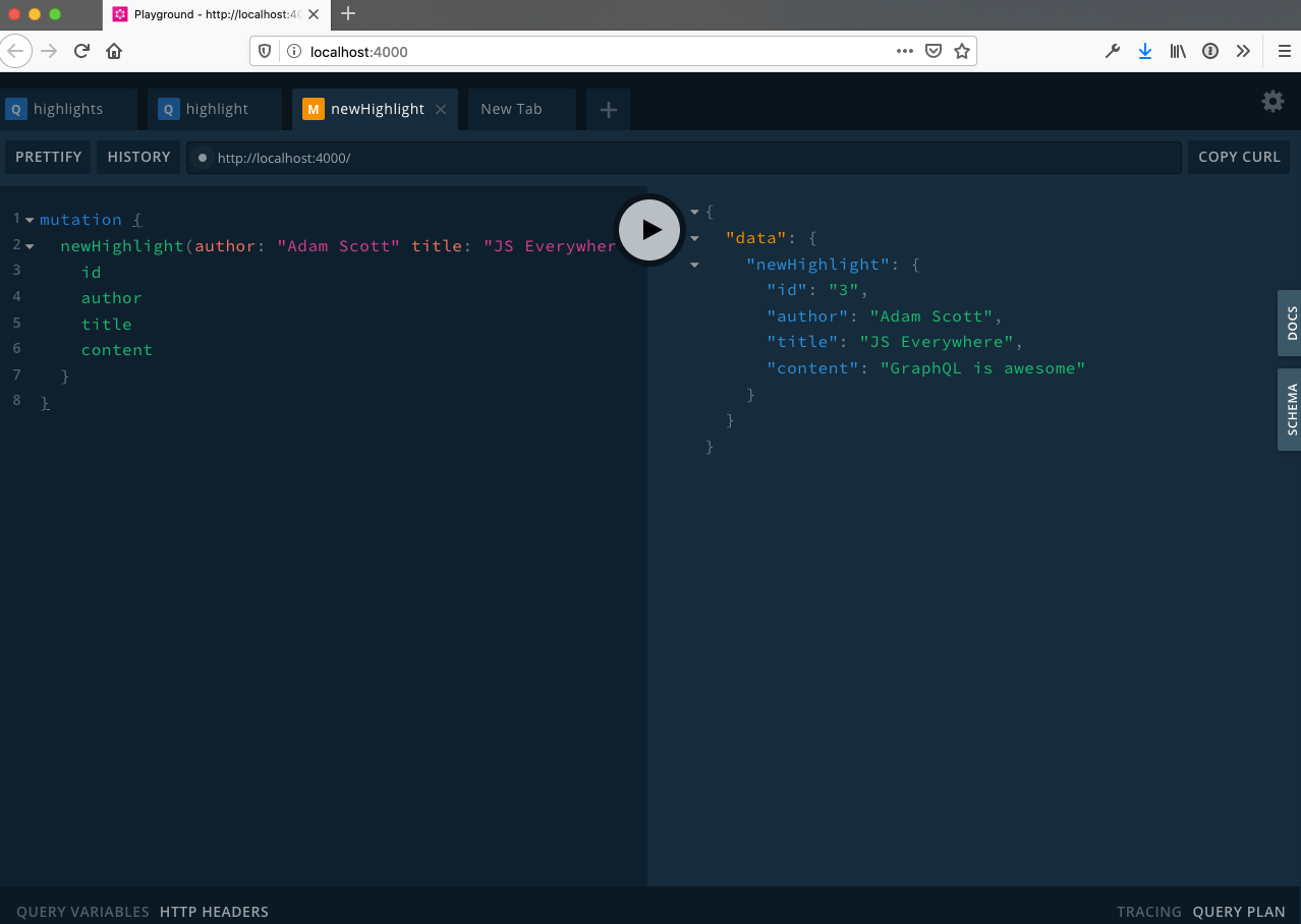 newHighlight(author: "Adam Scott" title: "JS Everywhere" content: "GraphQL is awesome") {
