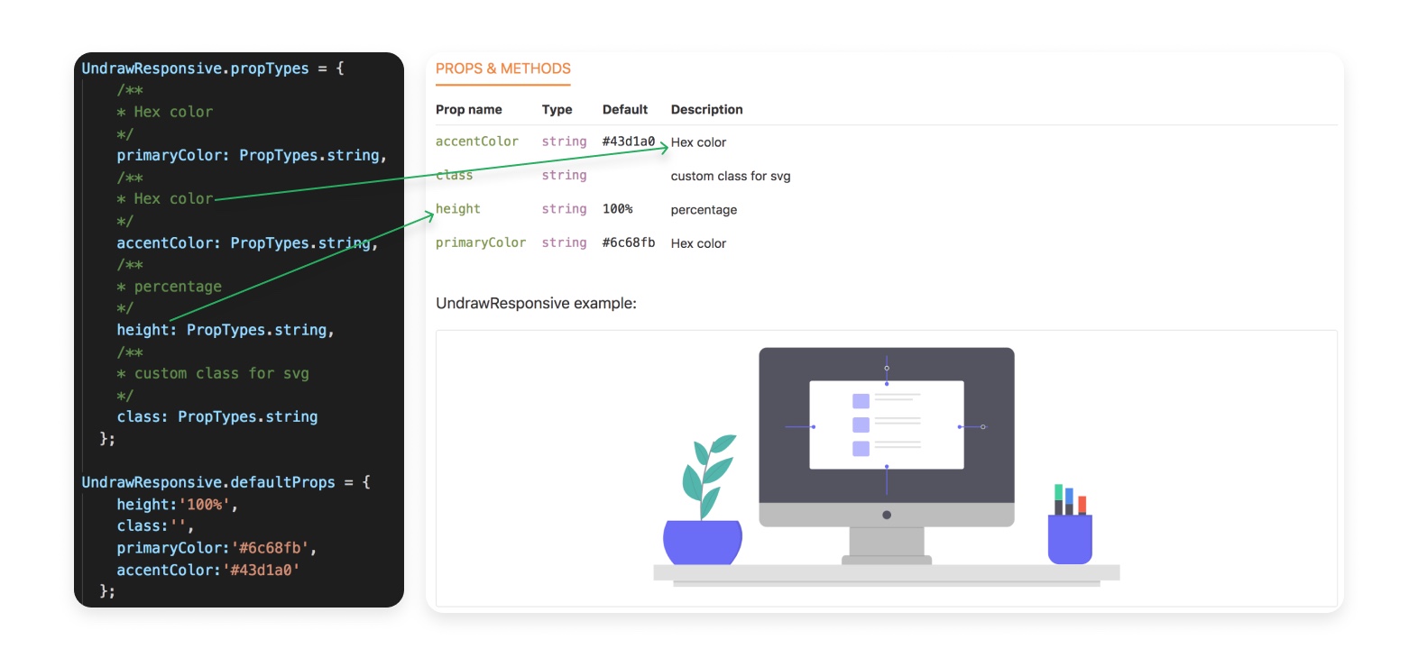 ,其中包含如何使用它的示例。内容可能如下所示// UndrawResponsive example ```js <UndrawResponsive height='250px' primaryColor='#6c68fb' accentColor='#43d1a0' /> ```